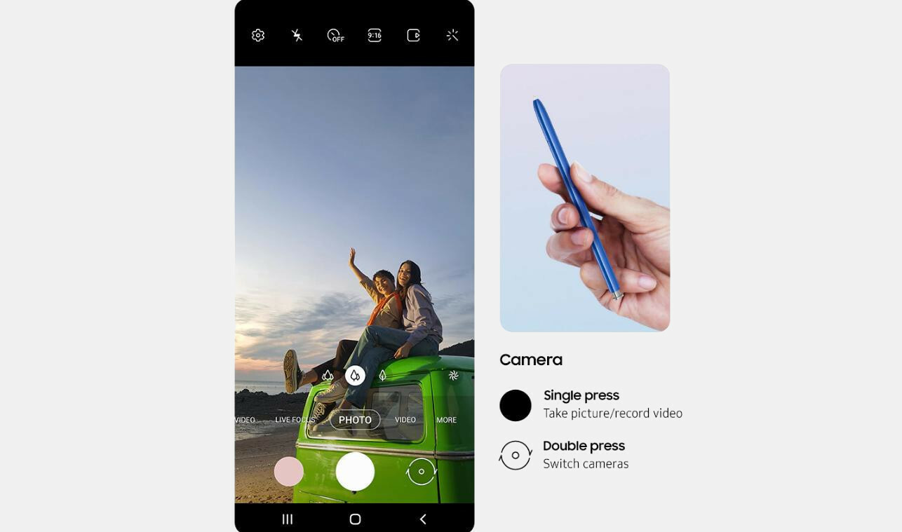 Το S Pen χρησιμοποιεί τη δύναμη της τεχνολογίας Bluetooth, λειτουργώντας ως χειριστήριο για το Galaxy Note 10 Lite. Με ένα ή δύο απλά πατήματα του κουμπιού, μπορείτε εύκολα να τραβήξετε φωτογραφίες χωρίς να χρειαστεί να αγγίξετε την οθόνη του smartphone σας, να μετακινηθείτε στη συλλογή φωτογραφιών σας ή για την αναπαραγωγή ή την παύση της μουσικής σας.